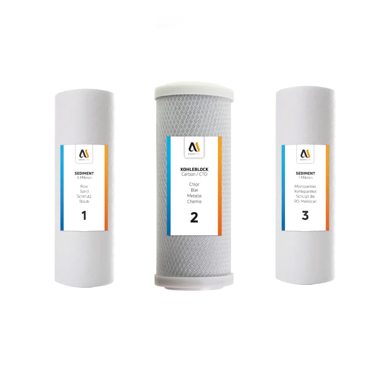 1 x Sediment-Filter 5 Mikron (Erste Stufe), 1 x Kohleblock-Filter (Zweite Stufe), 1 x Sediment-Filter 1 Mikron (Dritte Stufe)