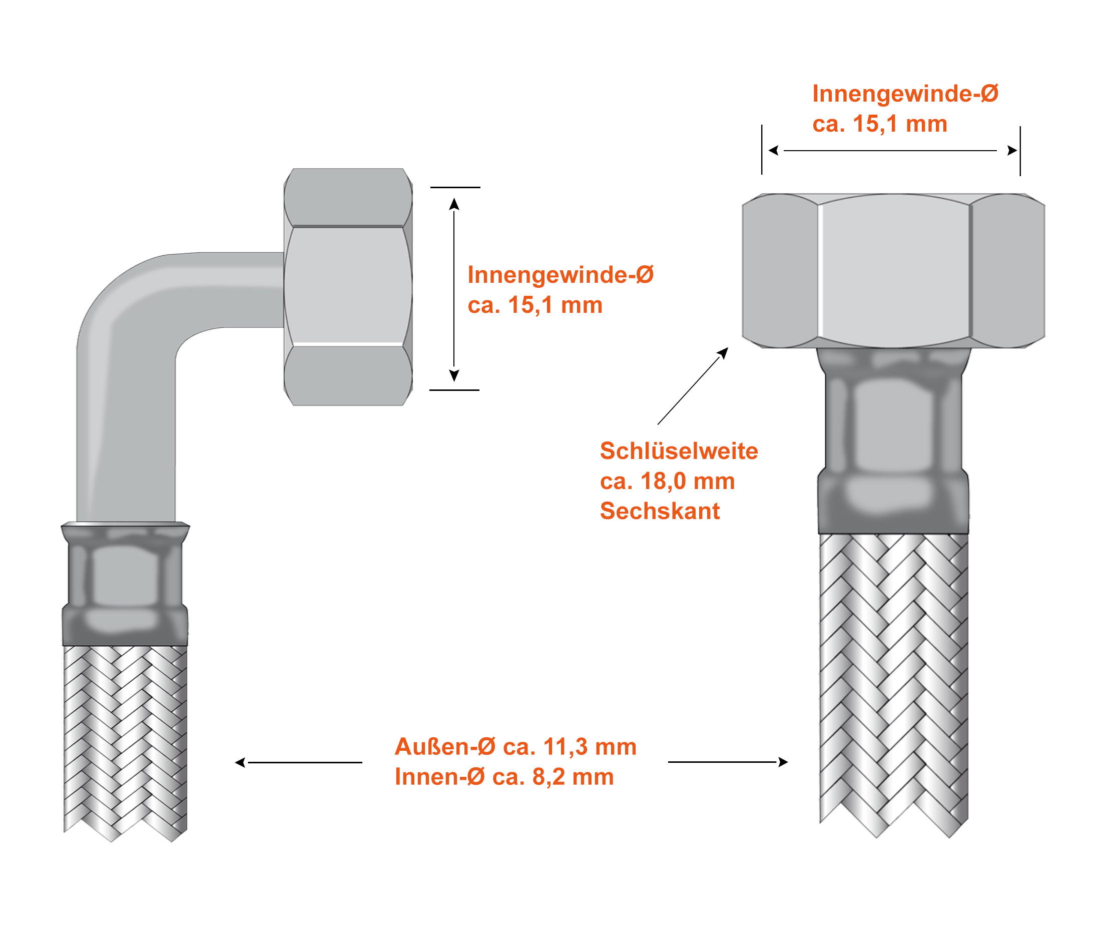 - Umflechtung: Edelstahl 1.4301